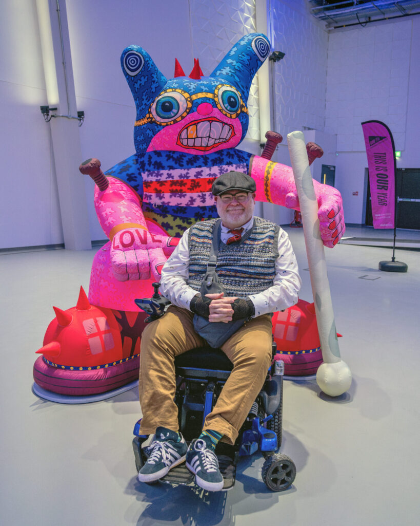 Born in Wakefield in 1969, Jason uses his art to celebrate disability, northern working-class heritage, popular culture and the stories that shaped his childhood. He has collaborated with local disabled community groups to create a brand-new artwork displayed in the Canopy outside WX.