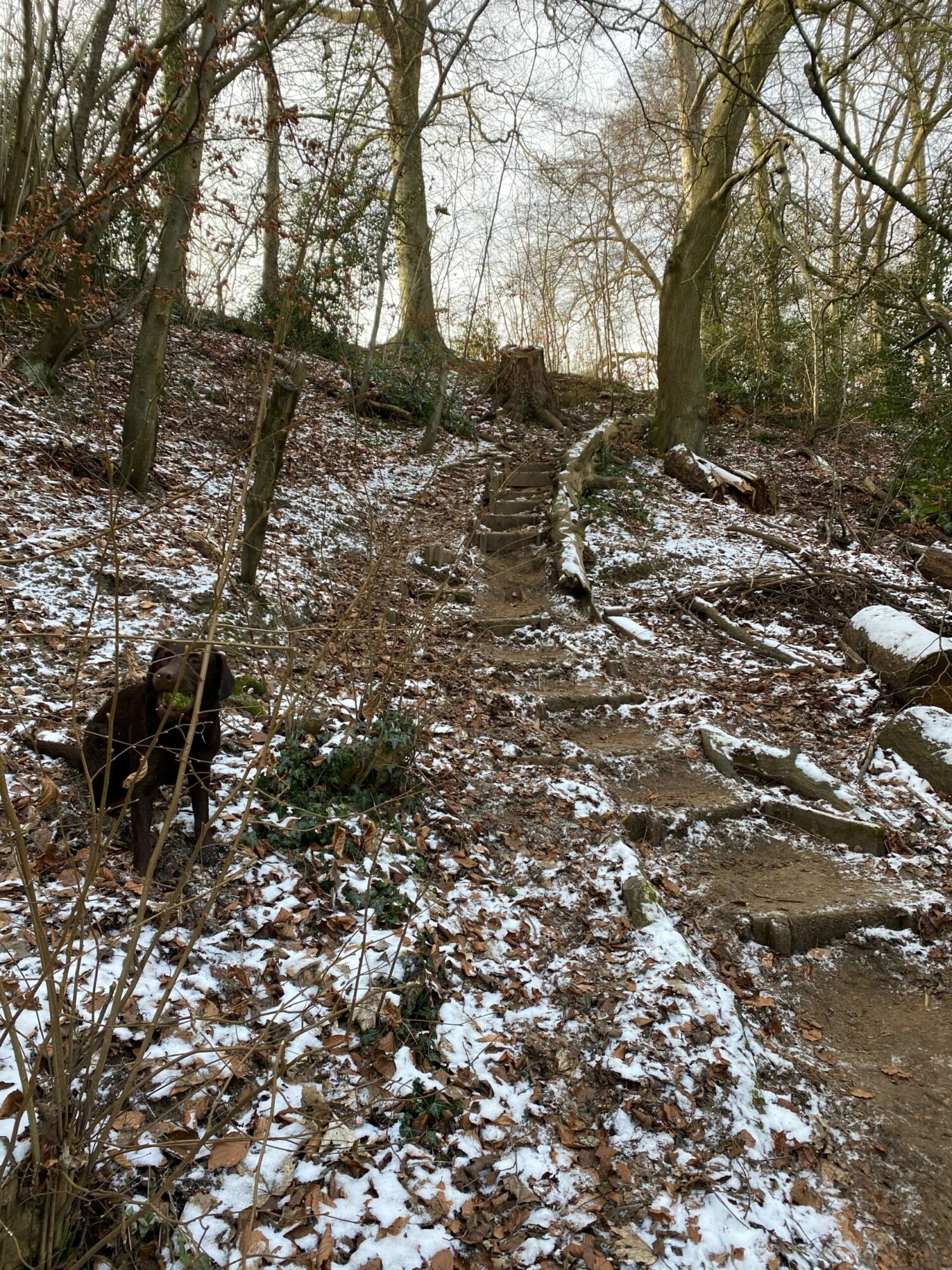 Continuing with the river on your right, you'll reach a narrow path, from which you can spot Stick Man in the river on a low water day. The steps leading upwards are breath-taking for another reason: you'll need to prepare yourself for the climb (and watch out for flying chocolate Labradors rushing back down again in pursuit of the ball)!