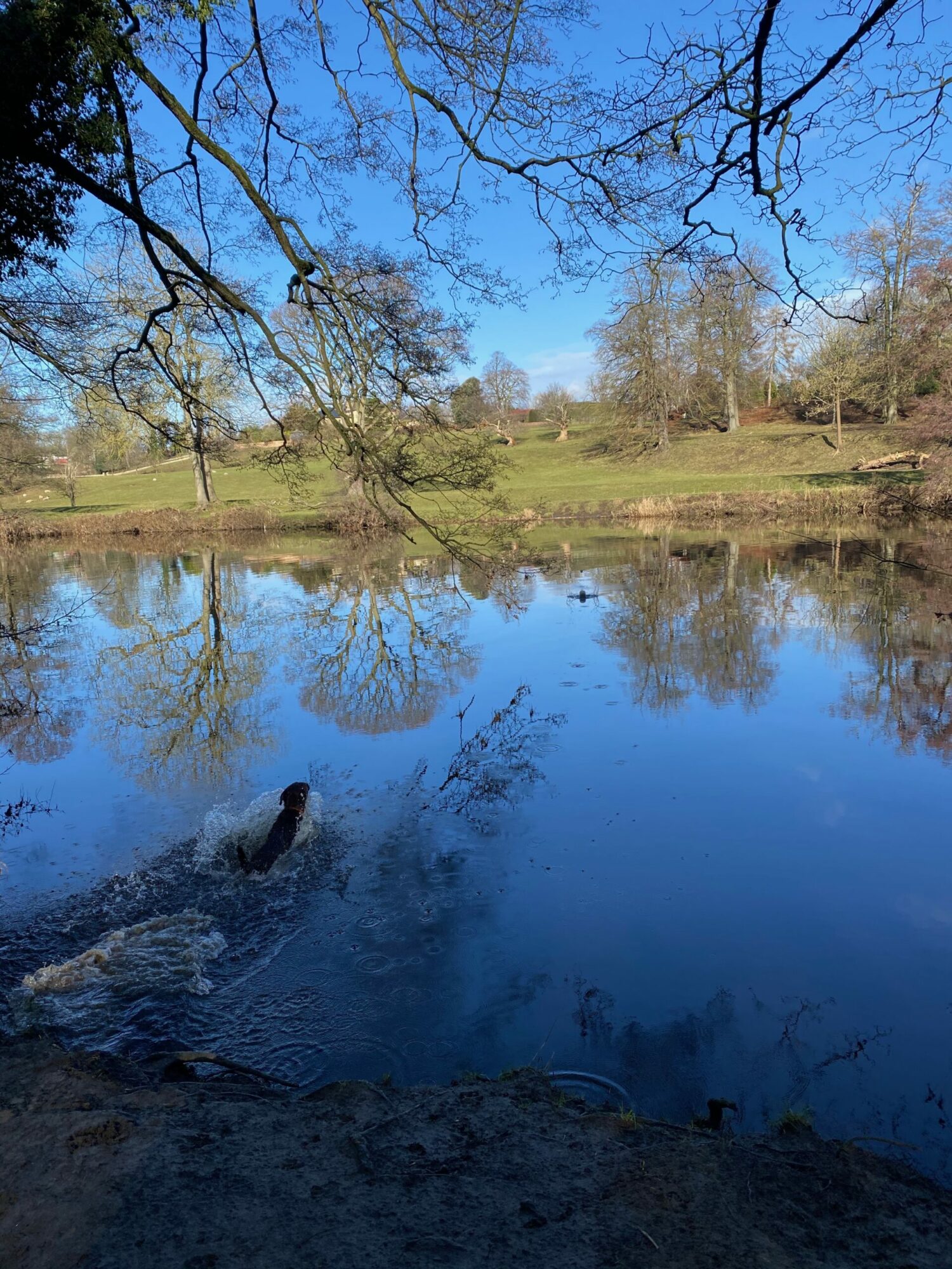 From here, the path to the right leads to a great swimming spot. It's always a joy to watch Merlin dive in for his ball- he's such a strong swimmer. It's far enough away from the weir to avoid the drift, while the reflection in the still river is glorious with a bright blue sky above.