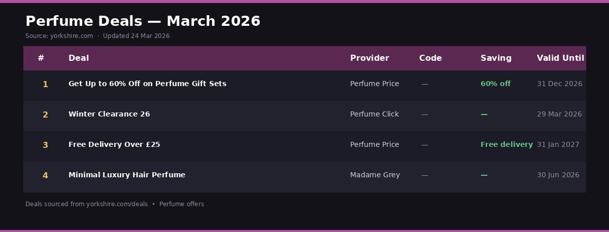 After comparing these four excellent fragrance offers, there’s a clear winner for almost every type of Yorkshire shopper. For maximum savings and forward-planning, the Perfume Price deal offering up to 60% off gift sets is our top recommendation.