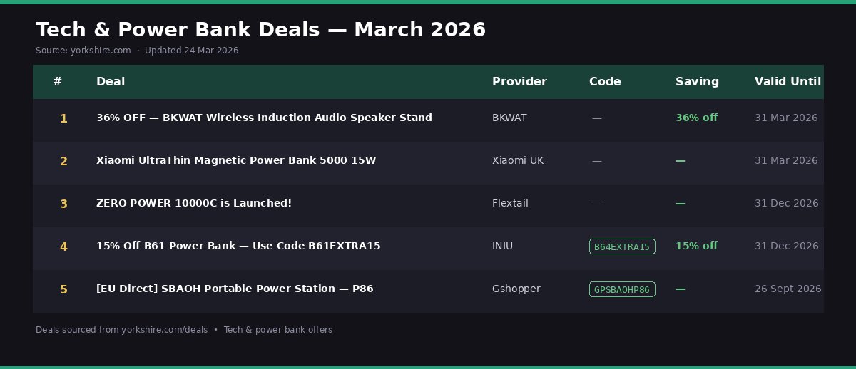 Choosing the right power bank depends entirely on your needs. A high-capacity model that’s perfect for camping is overkill for a night out, while a slimline charger won’t cut it for a weekend away. The table below provides a side-by-side comparison to help you quickly assess which deal is the right fit. For our Yorkshire readers who appreciate clear value, the deals from BKWAT, INIU, and Gshopper offer direct savings with either a percentage discount or a money-off voucher code.