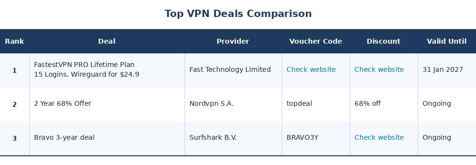 If you plan to connect several devices or in need of high-speed servers, the FastestVPN deal is a good pick. But, if you'd rather make a smaller upfront payment and still want a hefty discount, NordVPN’s deal with a 68% discount on their 2-year plan is a great bargain. Meanwhile, the Bravo 3-year deal from Surfshark offers exceptional value for those who don't mind a longer commitment.