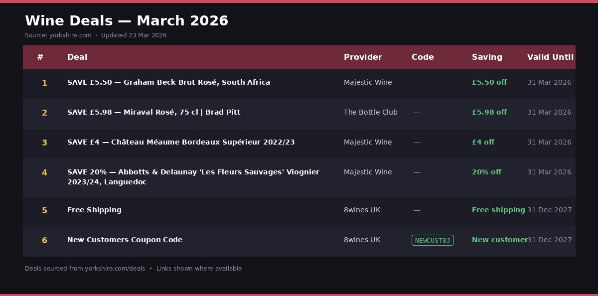 We've scoured the market to find the best current Yorkshire deals on wine, bringing you 6 excellent offers from well-known retailers. This comparison includes everything from celebrity-endorsed rosé to award-winning sparkling wine and classic French reds.