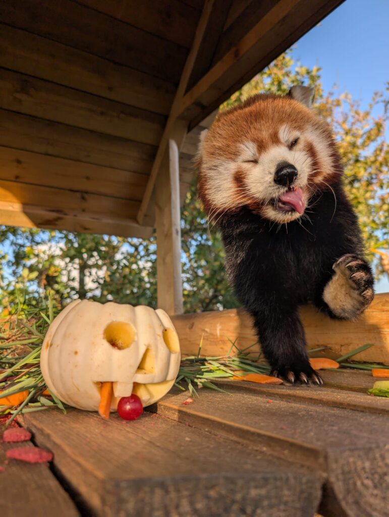 Halloween has spread beyond the polar bears at Yorkshire Wildlife Park. Across the park the Golden Lion Tamarins and Silvery Marmosets have been climbing into the pumpkin baskets high in the treetops and Alice the Red Panda has been investigating a pumpkin in her habitat.