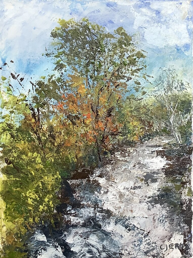 Carol Ertl’s work is all about texture and technique. Oils and acrylics, brushes and palette knives combine to give her pieces a 3D quality. Landscapes near and far are her subject matter, everyday scenes transformed into pieces that reveal hidden, layered details. She says “ideas form and morph” and often the finished piece surprises her too.