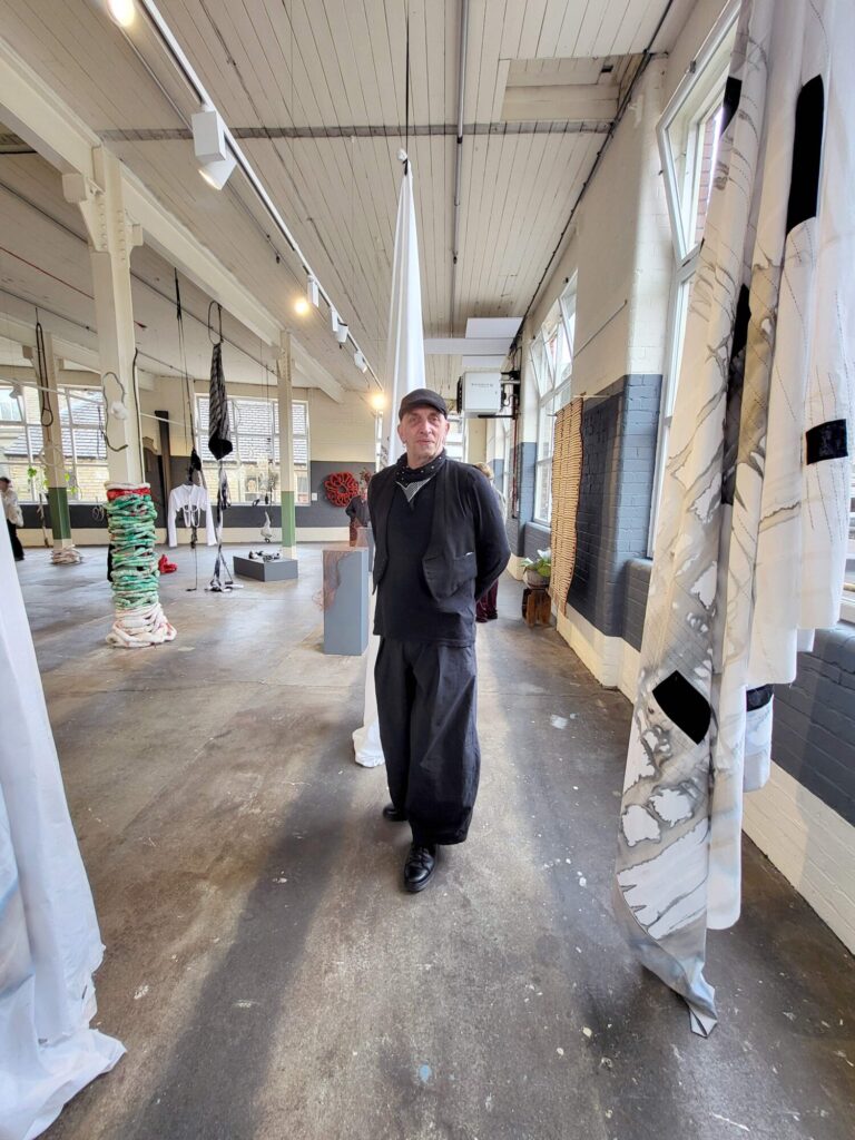 They’re fascinated by garments, fabric, and the way clothes shape how we move through the world. One of Andi’s pieces in the show is an “unmade suit” — a clever nod to the Mills’ past as a place that made top-quality suiting fabric, even if it never made the actual clothes.