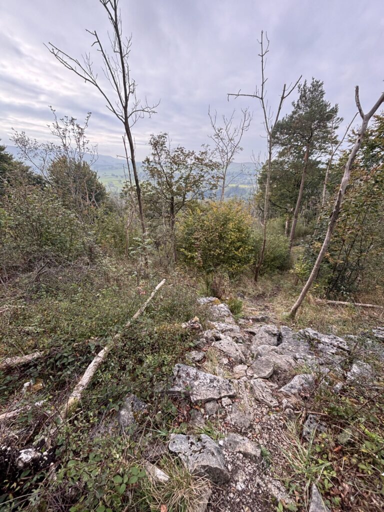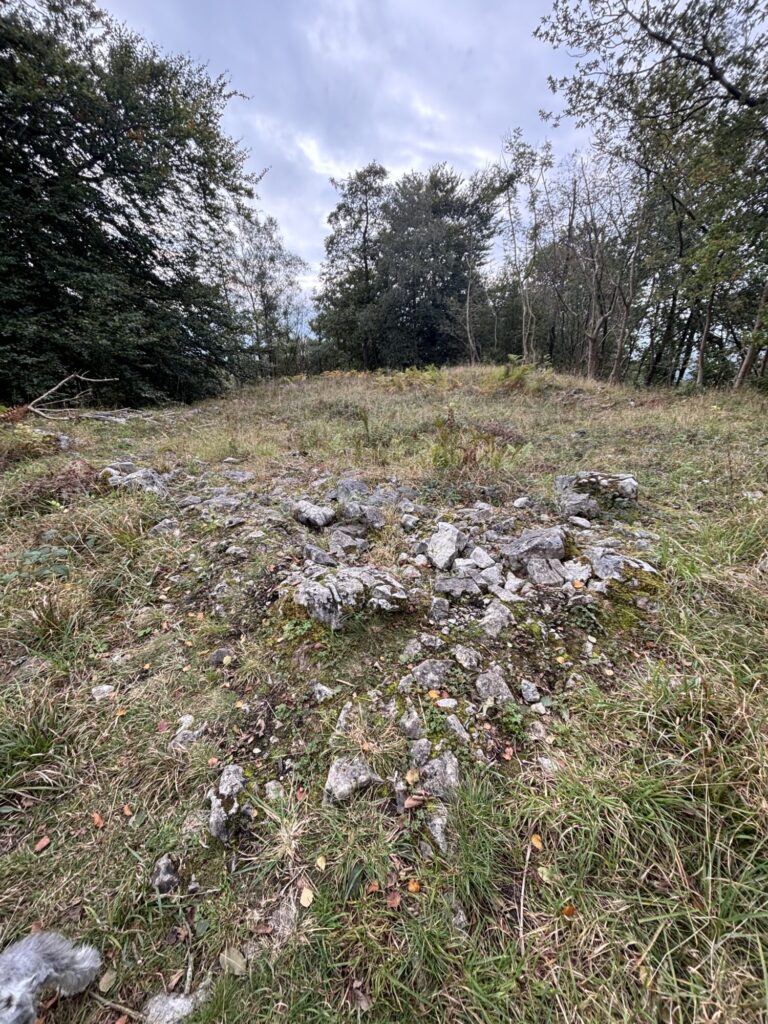 Fort Gregory is perched on one of these knolls. It comprises a small hilltop enclosure that would have been prominent in the landscape. From the path, it appears modest—a ring of broken stone and an earthen bank. It is not a great hillfort in scale, but rather what might be described as a small Iron-Age defended enclosure: a roughly circular or oval bank (or rampart) with traces of ditching in places. The defences would have been earthen banks, likely topped with wooden fences or palisades, whilst the natural slope of the hill helped with defence on some sides.