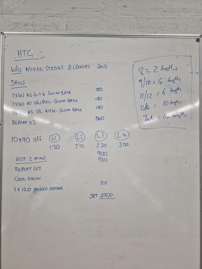 - Thurs – 1hr Club swim (2500m 10 x 90m on 1.50)