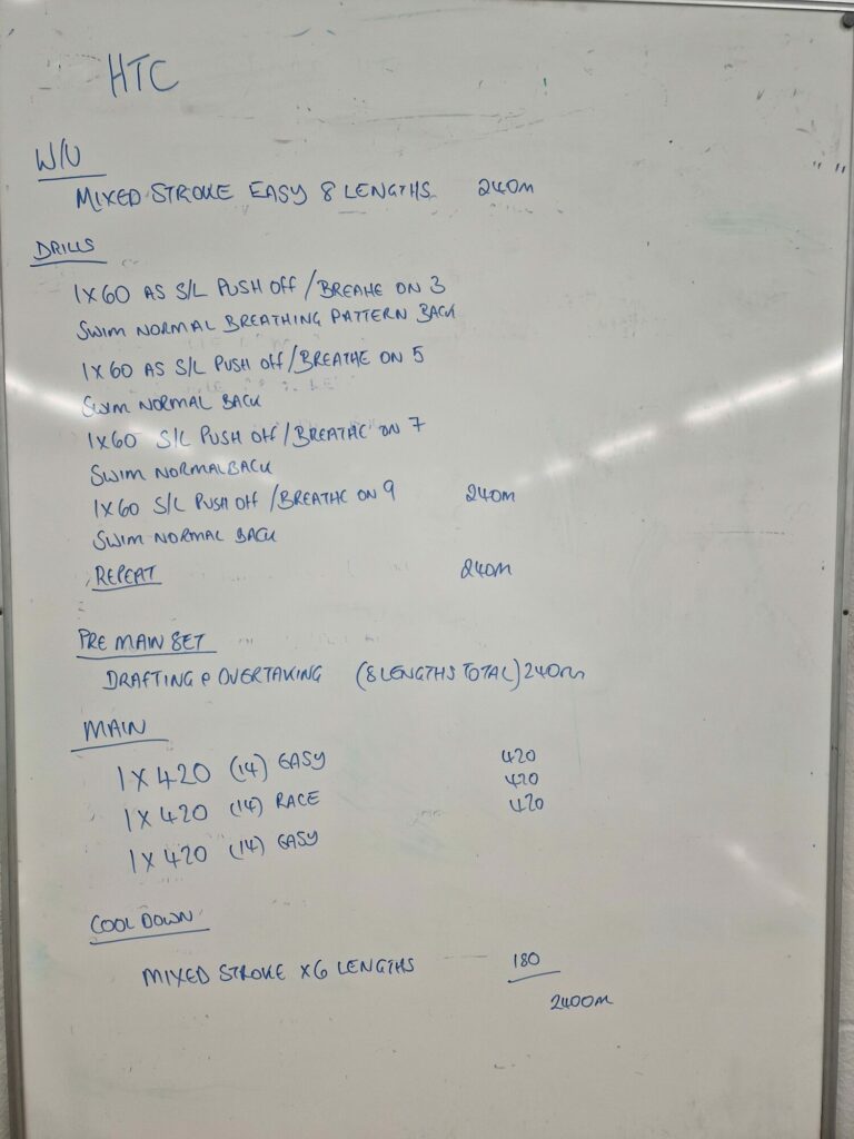 - Thurs – 1hr Club swim (2400m 3x420m/breathing drills)