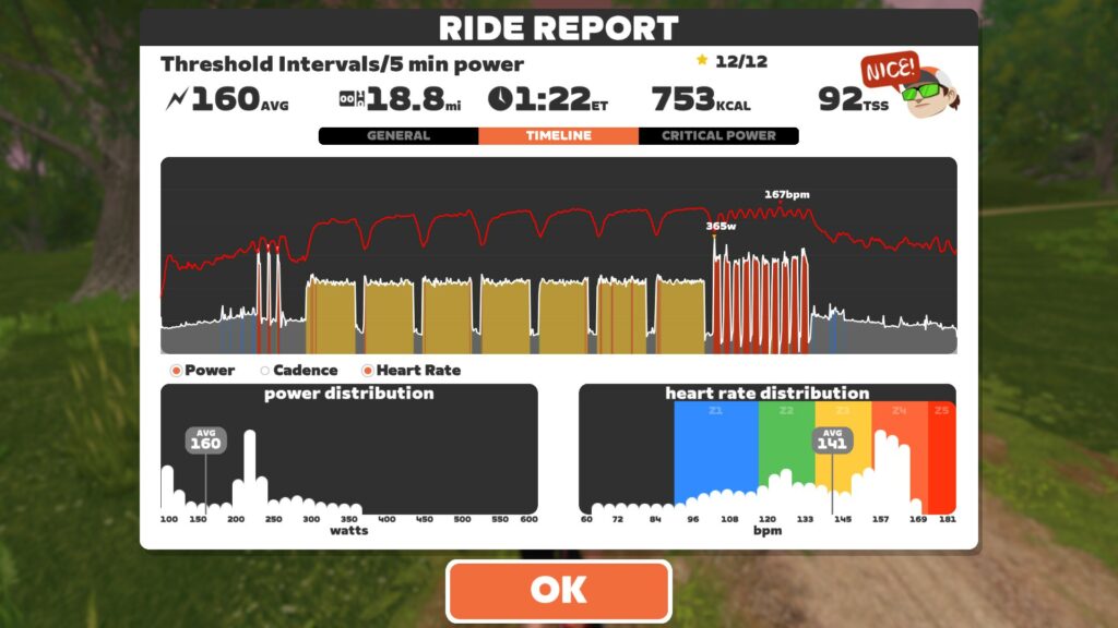 The second test was a 5-minute power test but this time there was extra aerobic efforts afterwards. Again, I went into it just to do my best and not to think too much about the outcome. Surprise again, I have increased my 5-minute power by 6 Watts. Very happy, although the 3 x 10 min efforts that followed were at the lower end of my power zone.