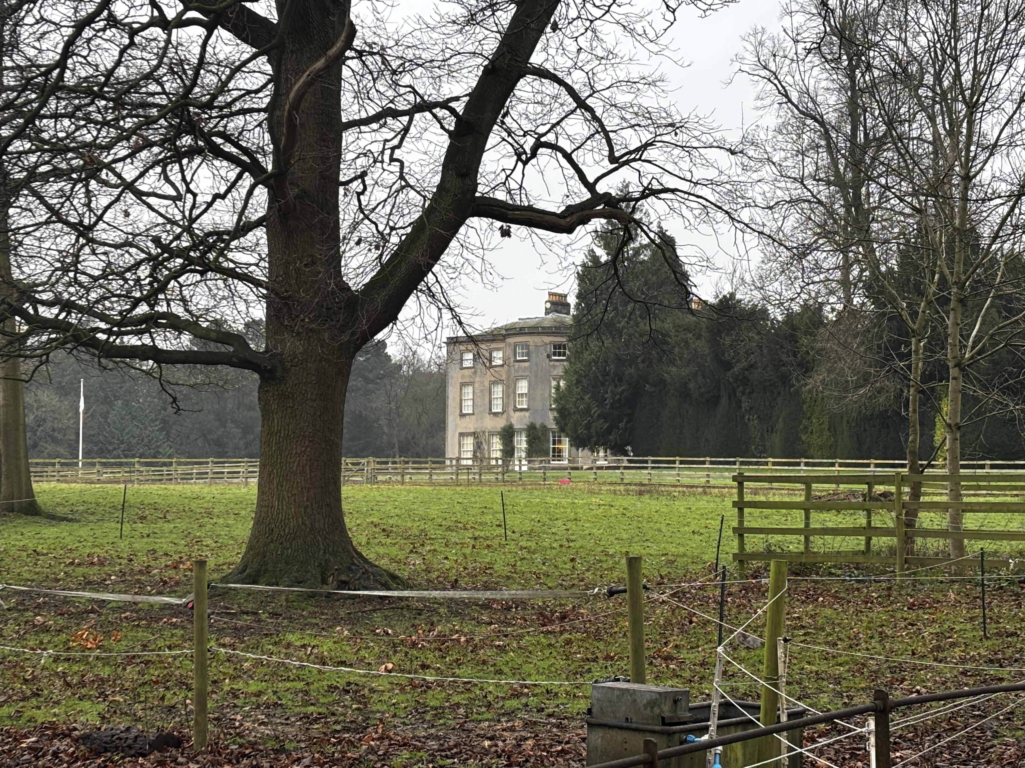 Surrounding the Hall is its landscape park and gardens, which reflect the growth of English country estate design from the 18th century onward. Around 1800, ornamental gardens and two lakes were laid out, probably under the direction of Adam Mickle, with terraced lawns cascading toward the water — a landscape that marries naturalistic principles with the controlled beauty expected of grand houses of the period. Specimen trees and topiary near the house accentuate the measured interplay between garden and architecture.