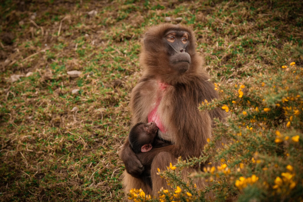 The new baby is still tiny and clinging to mum’s chest, so it’s too early to say if it’s a boy or a girl. Male Geladas grow long capes of shaggy hair and get those bright red chest patches. Females? A bit sleeker, a bit sassier.