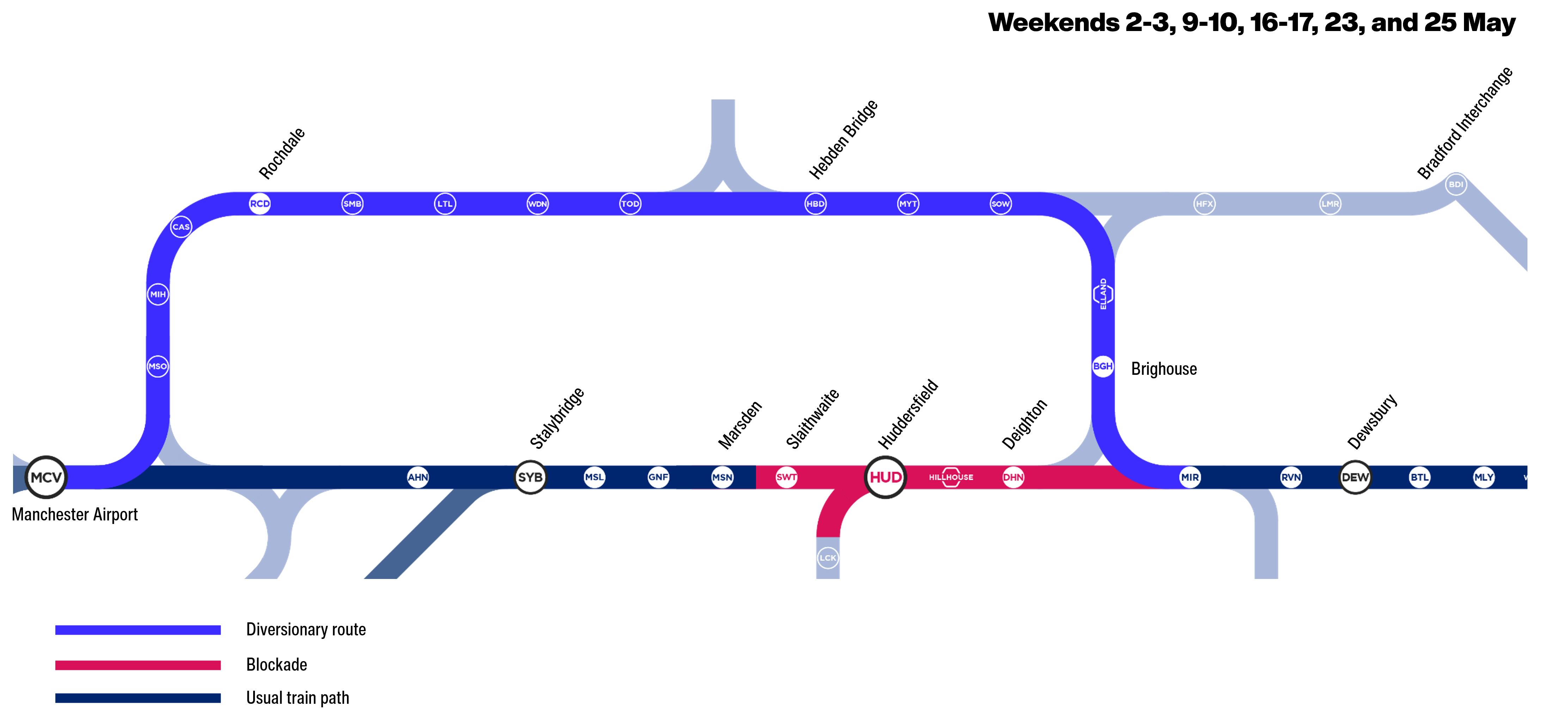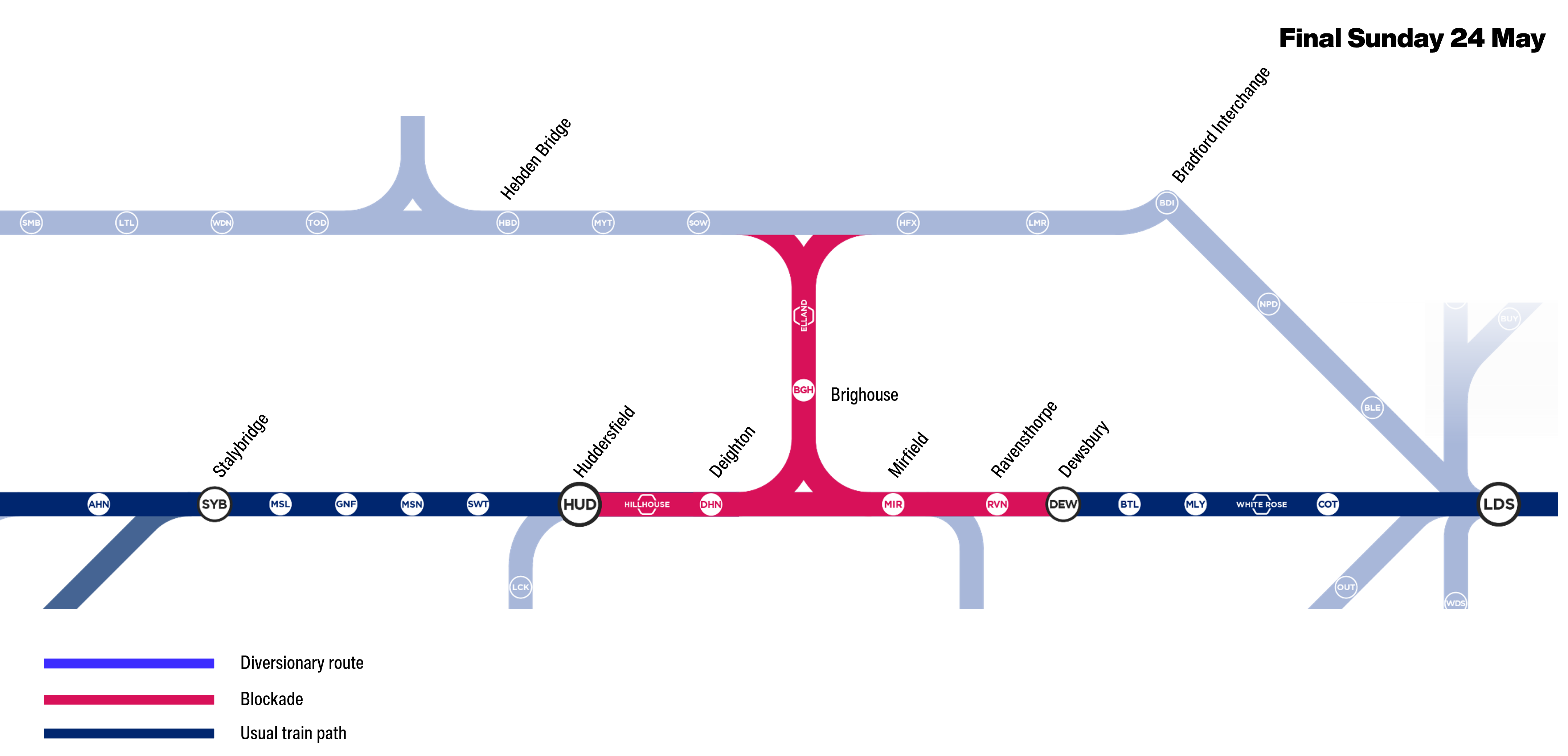 First up is the Bradley Junction Blockade. This is focused on the area between Deighton and Mirfield. It’s scheduled to run from Saturday 2nd May to Tuesday 26th May 2026. This post will give all the key details on this first phase.