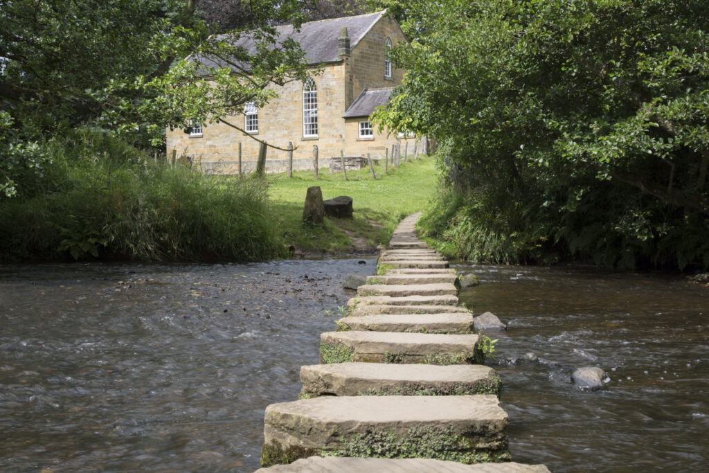 The Wesleyan (Methodist) Chapel of 1839 boasts stonework on its gable ends by local stonemason John Castillo, who was also known as the ‘Poet of the Moors’. Beside this Chapel, a footpath leads down to steeping stones across the river – note the tablet on the side of the Chapel that records the height of several devastating floods.