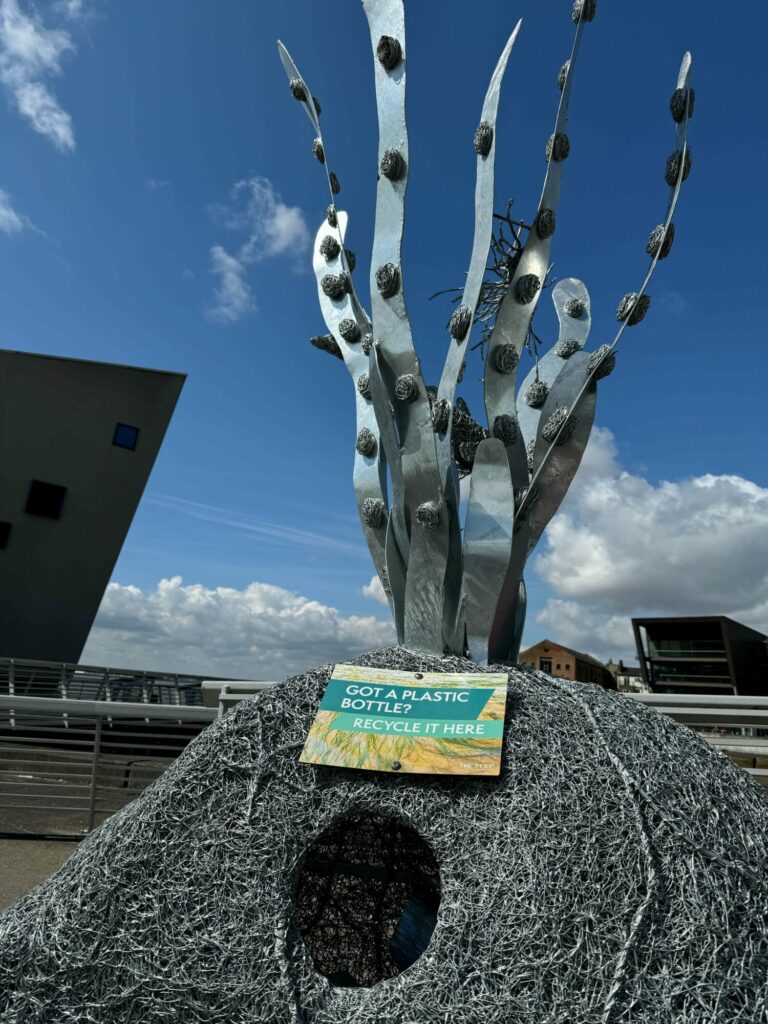 The newly installed seagrass sculpture, which also serves as a plastic bottle recycling station, is located beside the Millennium Footbridge. This footbridge connects The Deep to Humber Street and other central areas of the city, making the sculpture highly visible to passers-by. The dual purpose of this installation is to raise awareness about seagrass and local conservation efforts while providing a practical solution for plastic bottle recycling.