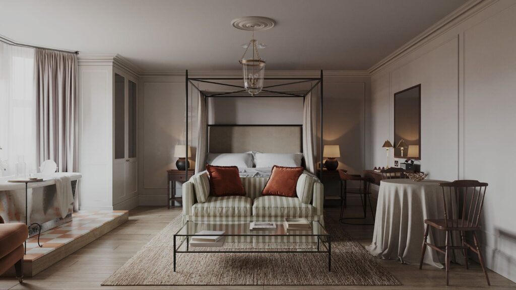 - Saltmoore House: The hub of the estate Saltmoore House is a 43 room hotel with interiors inspired by the moors and sea. Here you’ll find rooms from snug to luxurious suites, many with private balconies and roll top baths. For a romantic or special stay Saltmoore House has luxury interiors and a warm welcome.