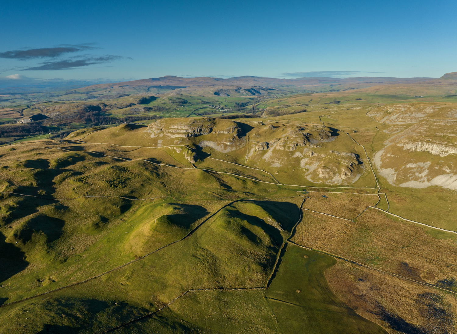 From The Golden Lion hotel, turn left down Duke Street, then left again down Chapel Street. Carry on and veer to the right up Victoria Street, then veer left up School Hill. At the junction, turn left (signposted Kirkby, Malham). Keep walking up this road, Albert Hill, until another junction of roads. Take the right fork here, following the sign for the Pennine Bridleway, along Mitchell Lane.