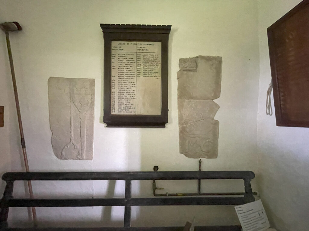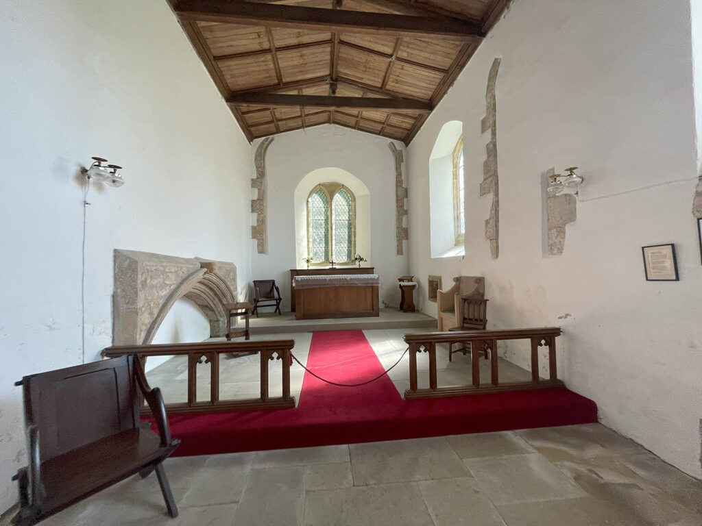 Vestiges of fabric dating to the Anglo-Saxon period can be found built within and placed throughout the church, including quoins, doorway jambs, semi-circular windows, Crossheads and Cross-shafts, and, in the porch, are two medieval grave covers, one dating to the 13th century with a cross base, shears, and the letters ‘M G’. Yet, the majority of the current structure appears to date from the Norman era, i.e., the 11th century, with much of the original planform remaining, though featuring 14th, 17th and 19th century alterations. Other features of note inside comprise, on the south side of the chancel, a piscina and a low-side window dating to the 14th century, while on the north is a 14th-century recessed niche, likely a founder’s tomb.