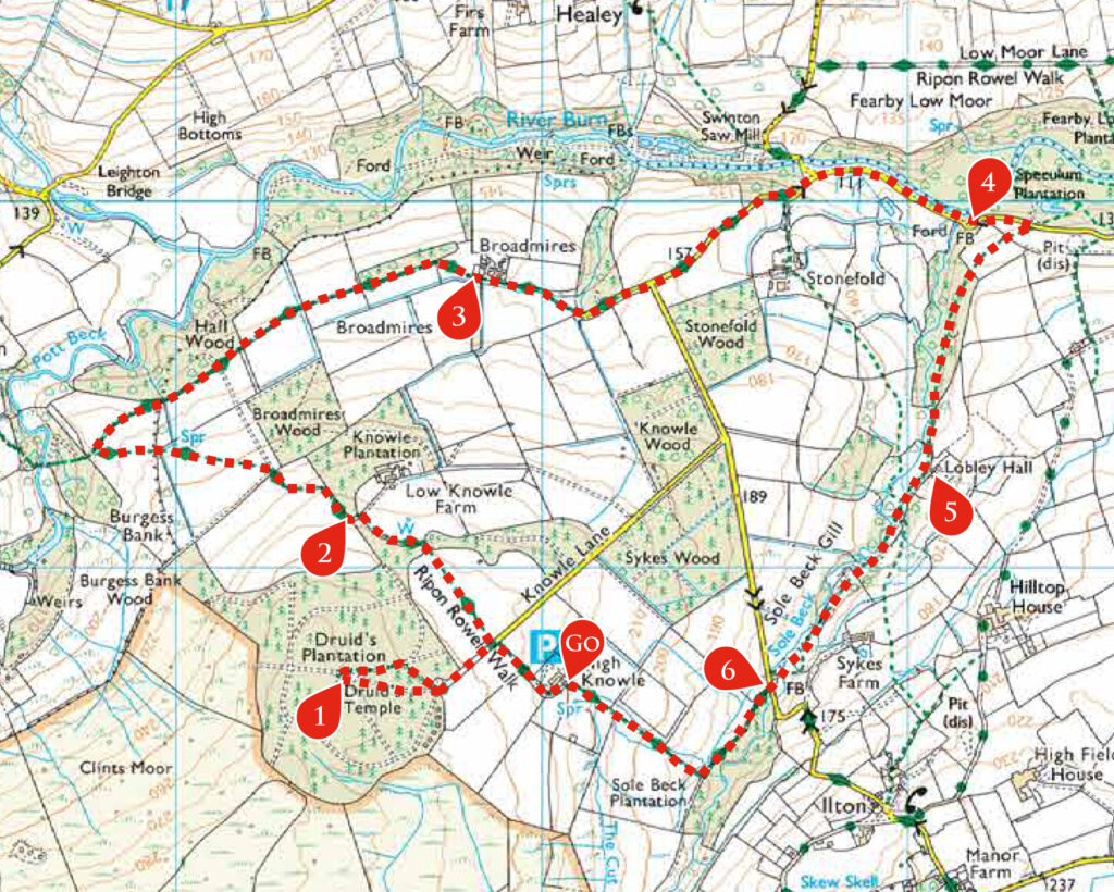 This is a 5-mile circular walk that takes in the mysterious Druid’s Temple folly and the ruins of Lobley Hall, some lovely moorland views and a sheltered and wooded valley, all on the Swinton Estate. The second half of the route has some uneven and steep sections and the final climb to the Swinton Bivouac café can be quite boggy.