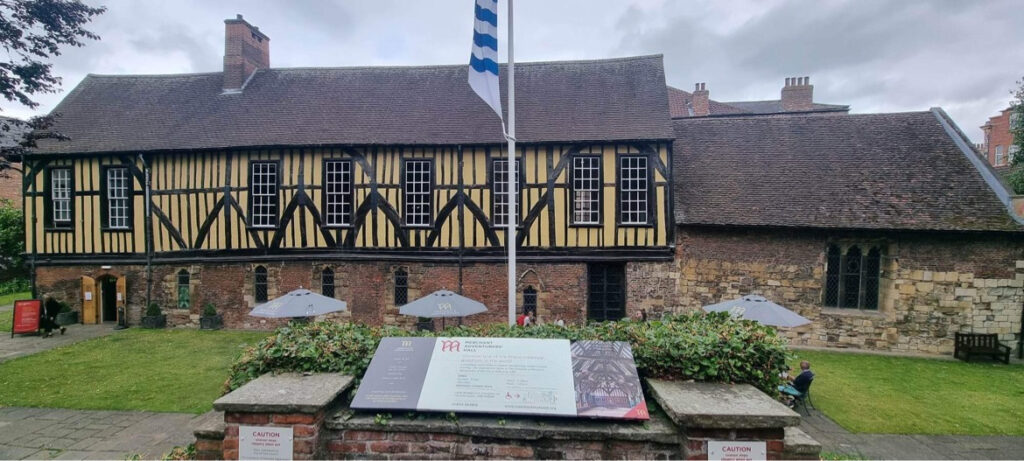 Pale yellow walls interlaced with black timbers and colossal red-brick chimney stacks convey the quintessential charm of the largest timber-framed building in York. This proud example of fourteenth-century vernacular architecture is the guildhall of the great buyers and exporters of woollen cloth—whose riches much of medieval England was built on—known as the Merchant Adventurers.